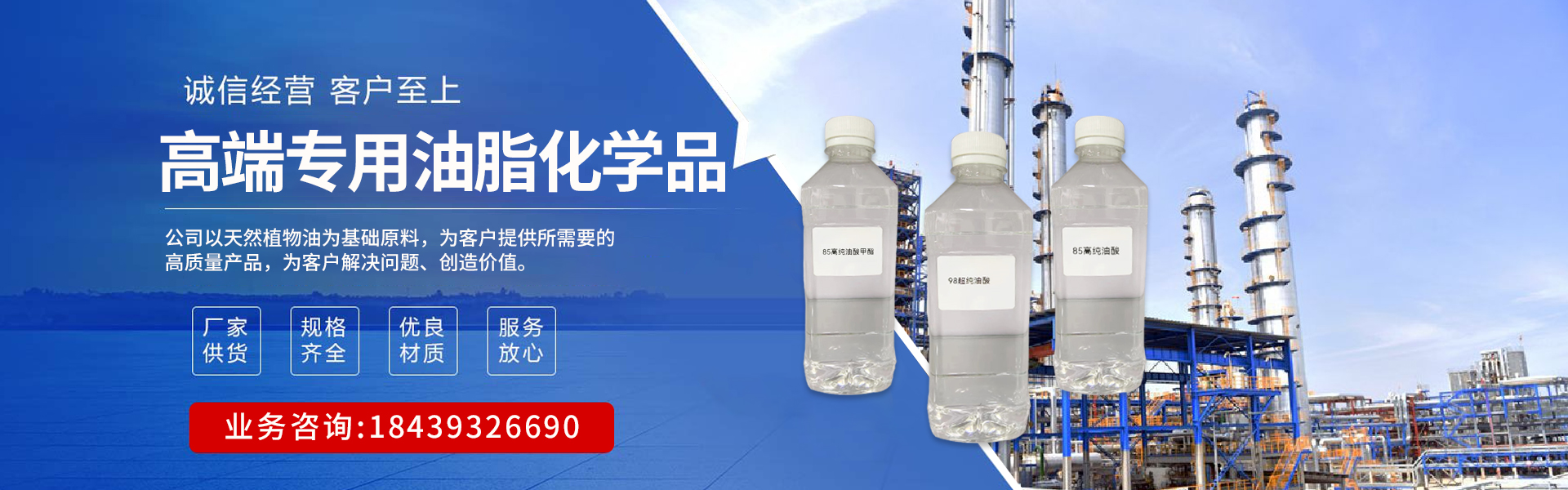河南康潤眾達生物科技有限公司位于河南省濮陽市,晉冀魯豫四省交界處核心地帶、位置優越,交通便利。是一家高端專用油脂化學品研發、生產企業,主營產品包括高(超)純硬脂酸、高(超)純油酸、高(超)純脂油酸甲酯、高(超)純二聚酸,及其衍生品包括三羥基甲基丙烷油酸酯等綠色生物化學品,公司以天然植物油為基礎原料,為客戶提供所需要的高質量產品,并根據客戶特殊需求定制相應油脂化工產品,為客戶解決問題、創造價值。      公司一直秉承“品質至上,誠信服務”的服務理念,客戶滿意是我們永無止境追求的目標。公司業務現已遍布全國。          公司本著“誠信為本、互惠互利”的原則,服務好每個客戶,愿與各界朋友精誠合作!...